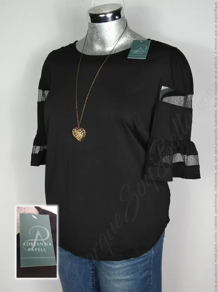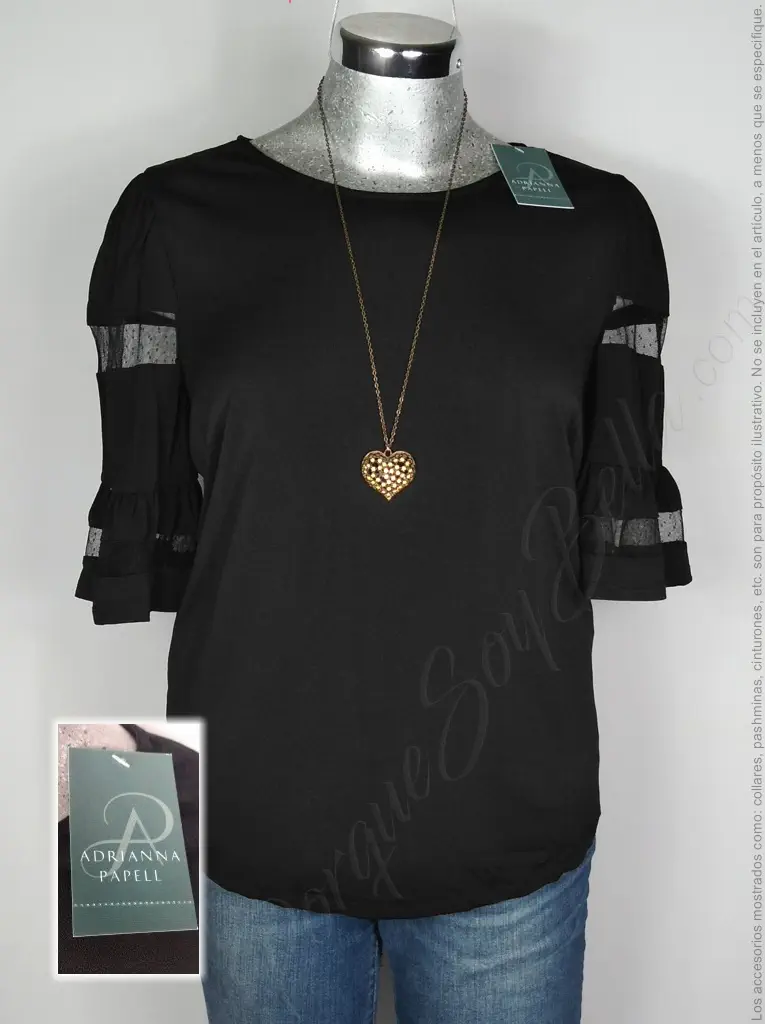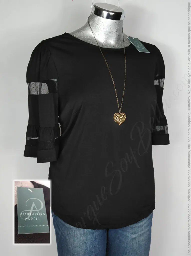 Elegancia Sutil: Blusa Adrianna Papell en Negro con Manga Corta Circular y Detalles en Mesh