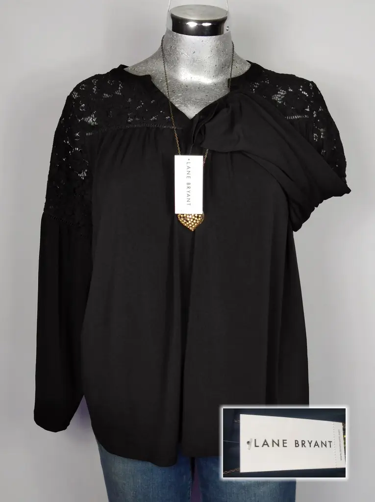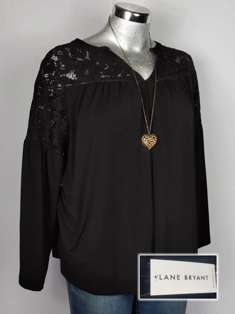 Esta elegante blusa negra de Lane Bryant destaca por su delicado encaje en el cuello y los hombros, añadiendo un toque sofisticado y femenino. La manga larga en A le da un aire fluido y cómodo, mientras que el corte en A favorece la silueta. Perfecta para ocasiones especiales o para un look chic de oficina. Hecha de poliéster, es fácil de cuidar y mantener. Disponible en talla 18/20 (40).