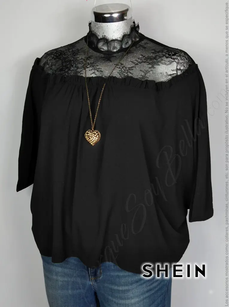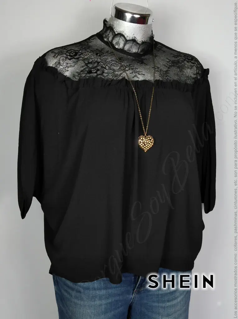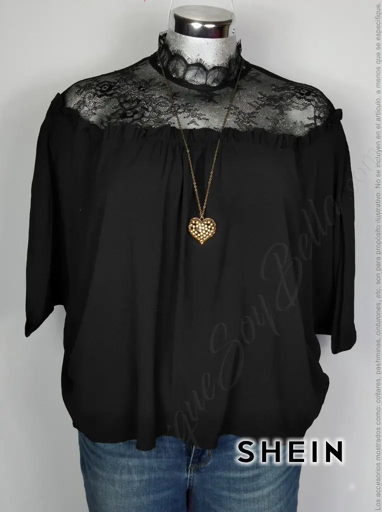 La blusa Shein en color negro es perfecta para un look elegante y sofisticado. Su pantalla de encaje en el cuello y escote alto aportan un toque delicado, mientras que las mangas 3/4 batwing le dan un aire moderno y cómodo. Hecha de poliéster, esta prenda con corte batwing ofrece una caída fluida y un ajuste relajado. Disponible en talla L (36/40), es ideal para ocasiones casuales con un toque de distinción.