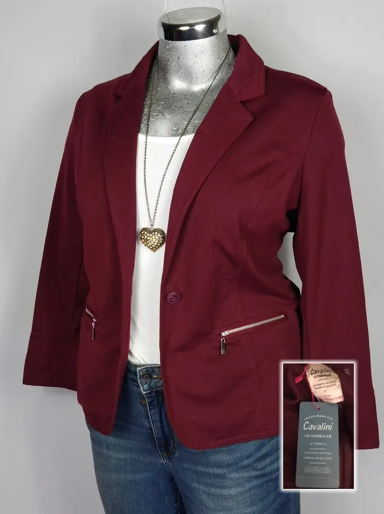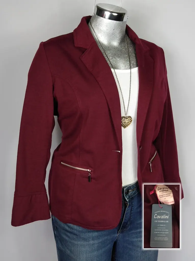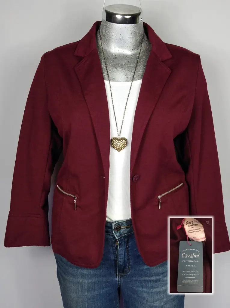 Este elegante saco de Cavalini Outerwear en color vino es una pieza clave para tu colección. Con una doble solapa en V y una simulación de bolsa con cierre, aporta un toque sofisticado a tu atuendo. Sus mangas largas con puño y el botón al frente le dan un acabado pulido. El corte slim fit resalta tu figura, mientras que el poliéster garantiza durabilidad y confort. Disponible en talla 1X (38/40), es perfecto para ocasiones formales o para darle un toque elegante a tu look diario.